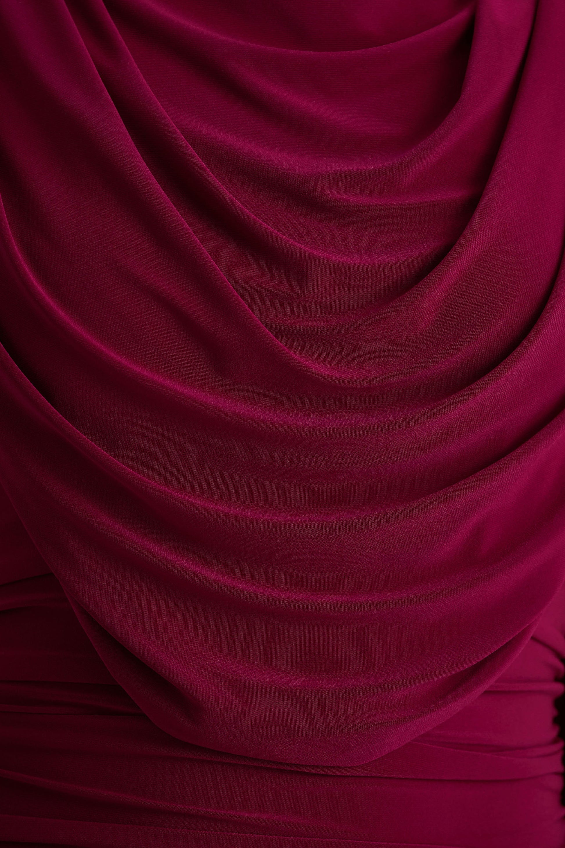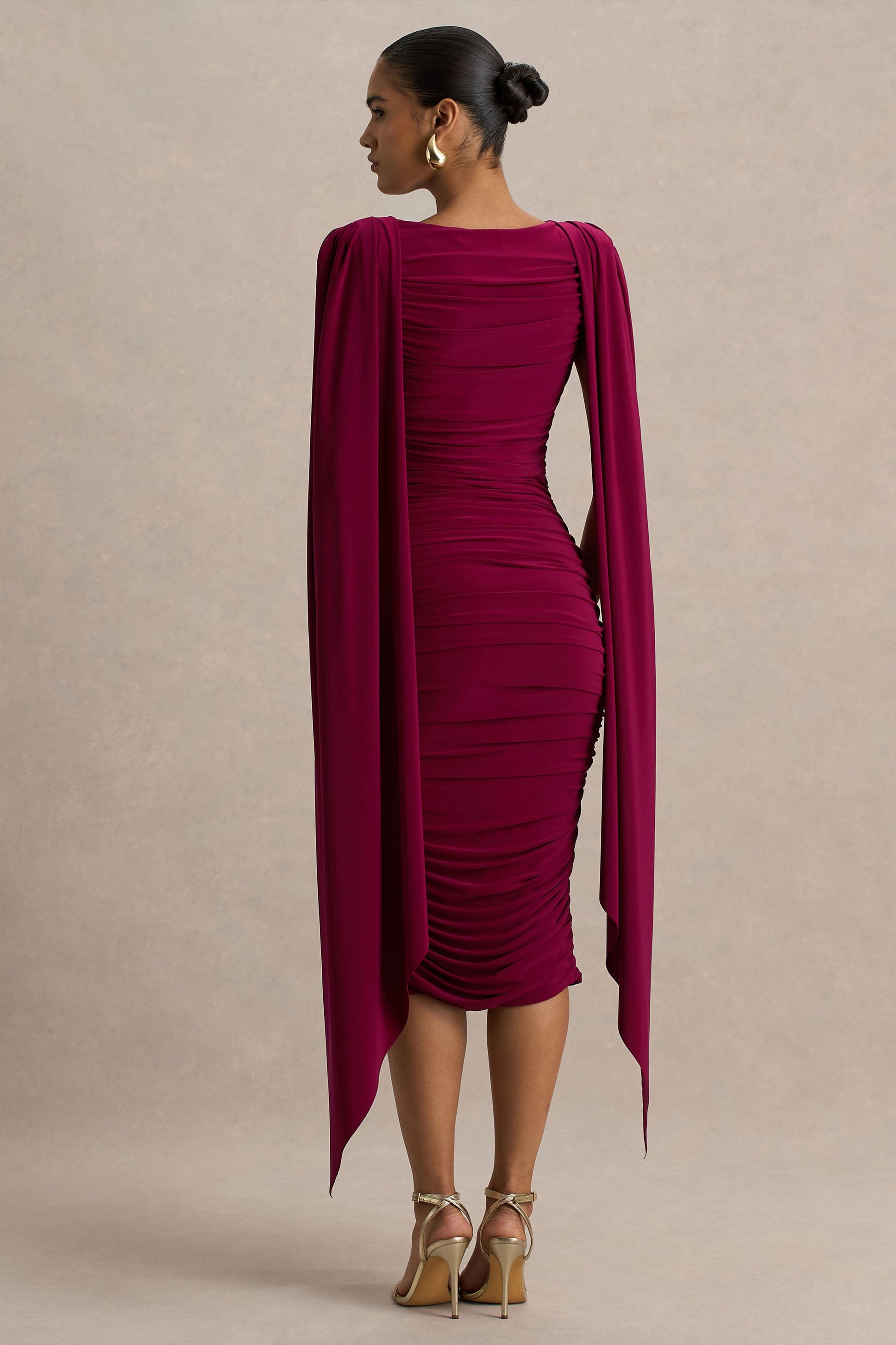 Command attention in Wanderer, a powerfully feminine silhouette designed to stun. Cut in a deep burgundy hue of our premium stretch jersey, this midi is designed to sculpt and define your curves. Featuring all over ruched detailing for the ultimate figure flattering finish and statement draped panels that cascade from the shoulders, adding movement and drama with every step. Wanderer is the perfect option for a head turning entrance.