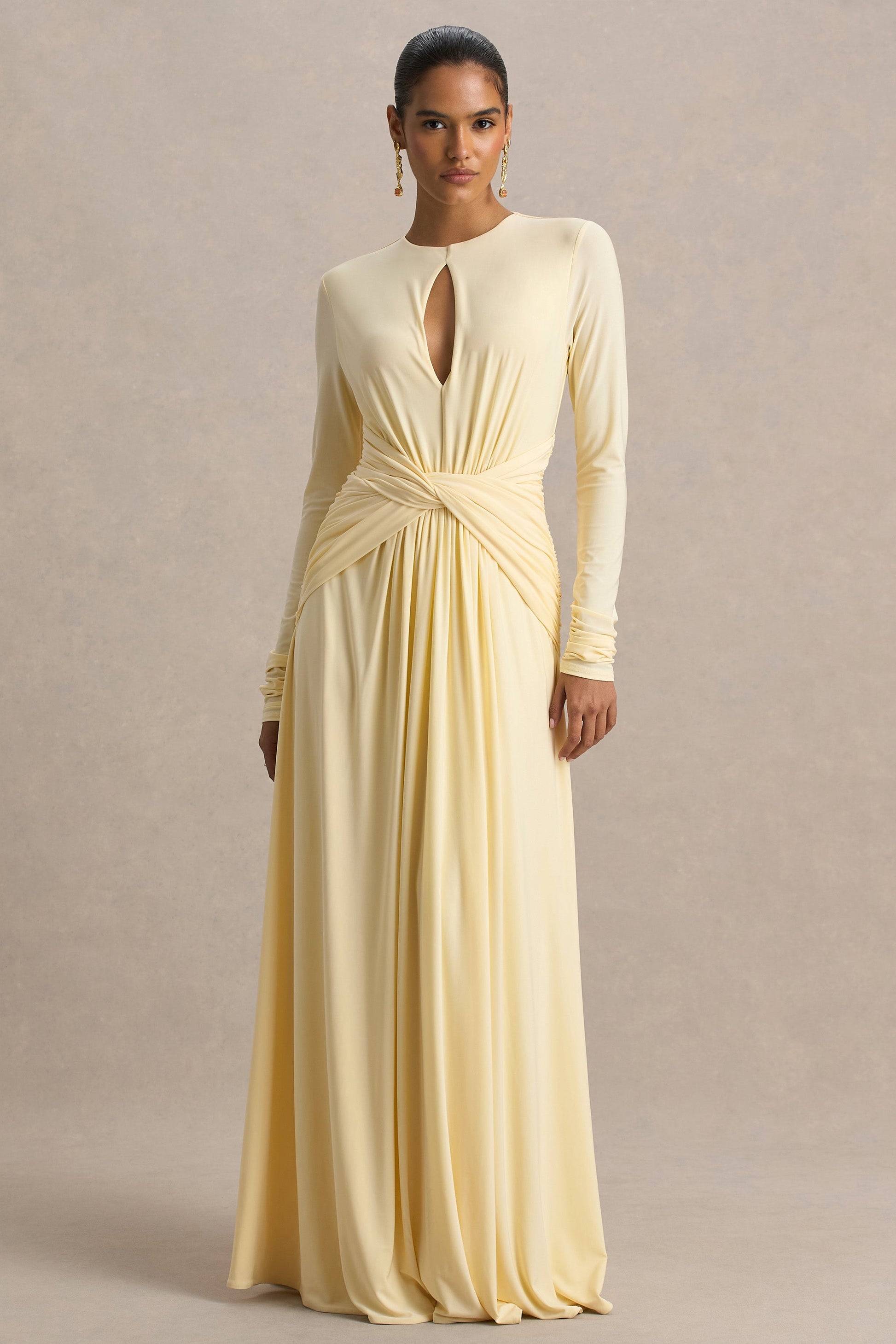 Introducing our latest head-turning gown, With me. Curated in a striking lemon shade of our premium stretch jersey, this maxi will sculpt your figure effortlessly. Featuring a bold twist detail at the waist that not only flatters but add a modern edge to this elegant piece. Finished with delicate ruched detailing, this dress is one you wont be forgotten in. Style with a chic up-do and exude confidence.