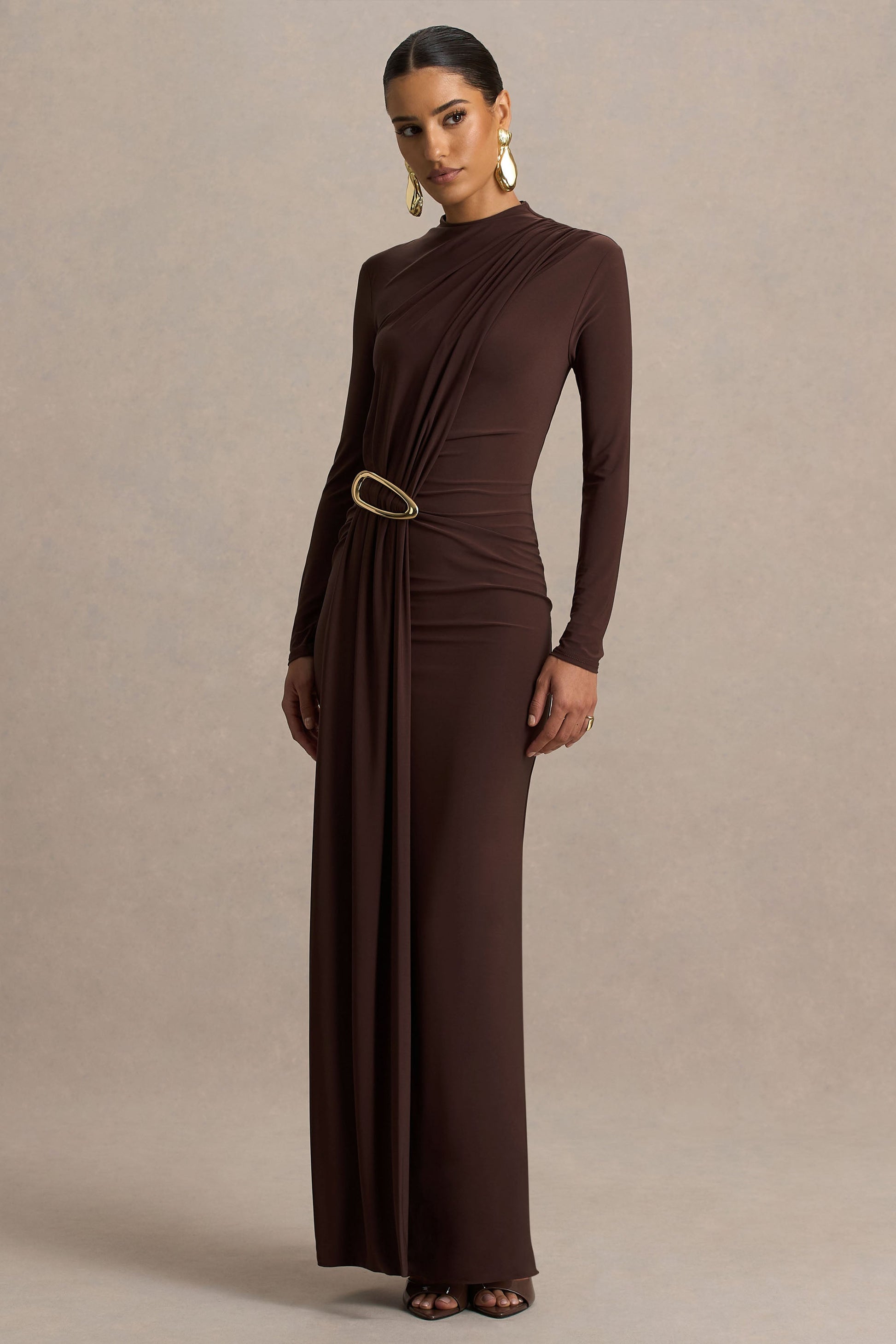 Elevate your wardrobe with the effortlessly chic Zadie. Crafted from our premium stretch jersey, in a warm brown hue, this maxi is designed to flatter your curves from every angle . The high neckline and subtle gathered detailing create an elegant, modern silhouette, while the gold hardware at the waist adds a hint of glamour. Perfect for cocktails, dinners, or any occasion where you want to make a statement.